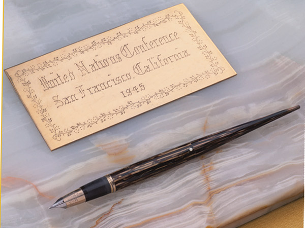 اکتبر 24, 2024باعث افتخار شیفر است که مهمترین سازمان بین المللی یعنی سازمان ملل متحده اولین بار با قلم شیفر پا به عرصه وجود گذاشت و رسمیت یافت منشور سازمان ملل در سال 1345 میلادی در کنفرانس سازمان ملل متحد در شهر سانفرانسیسکو آمریکا توسط تمامی اعضا امضا گردید و آن زمان به بعد سازمان ملل متحد رسمیت یافت. افتخار شیفر آن است که تمام اعضا با خودنویس شیفر این منشور را امضا نمودند و با پذیرش این منشور به عضویت رسمی سازمان ملل در آمدند.