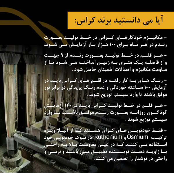 - هر قلم در خط تولید کراس باید در 120 آزمایش گوناگون روزانه بصورت رندم موفق باشند تا وارد سیستم توزیع شوند .